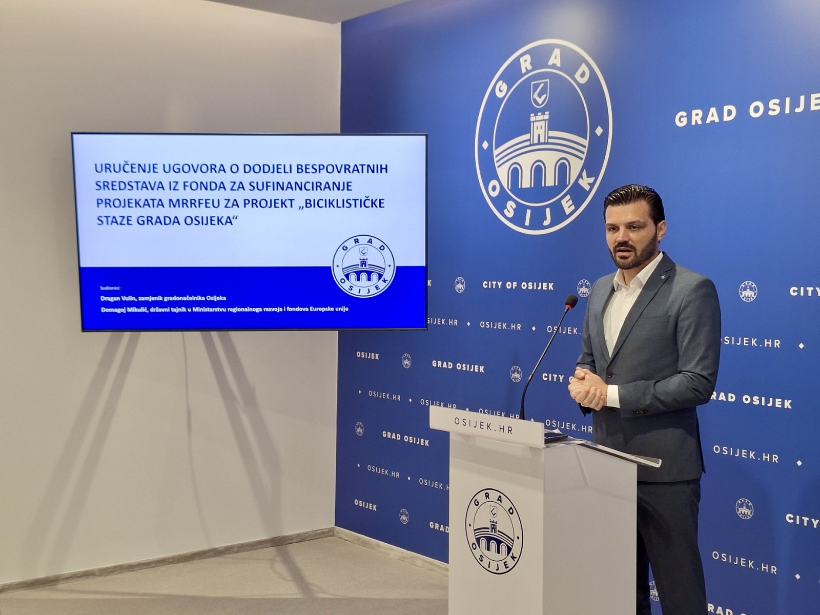 Ugovor vrijedan gotovo 900 000 eura zamjeniku gradonačelnika Draganu Vulin predao je državni tajnik Domagoj Mikulić, čime je omogućeno dodatno smanjenje udjela Grada Osijeka u financiranju ovog strateškog infrastrukturnog projekta.